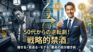 50代サラリーマン必見!禁酒を「我慢」ではなく「自分への戦略的投資」と定義し、痩せる・若返る・モテるを実現する術を解説。生化学に基づいた脂肪燃焼の仕組みや、見た目が激変する美容効果、1ヶ月の成功ロードマップまで網羅。人生後半戦を輝かせる秘訣がここに。