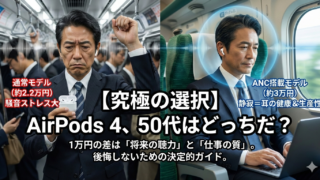 AirPods 4の通常モデルとANC搭載モデル、1万円の差額に悩む50代サラリーマン必見!本記事では単なる機能比較だけでなく、将来の難聴・認知症リスクを抑える「耳の健康」や、仕事の生産性を高めるROIの視点から徹底解説。カナル型が苦手な世代に最適なオープンイヤー型の魅力、Pro 2との違い、後悔しない選び方まで。あなたの1万円を価値ある投資に変える決定的なガイドです。